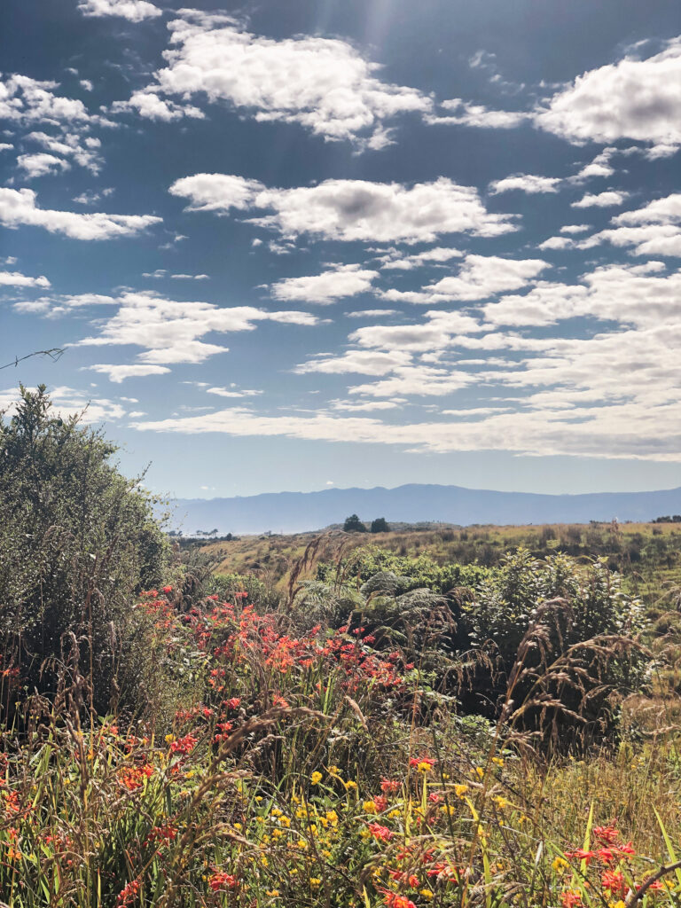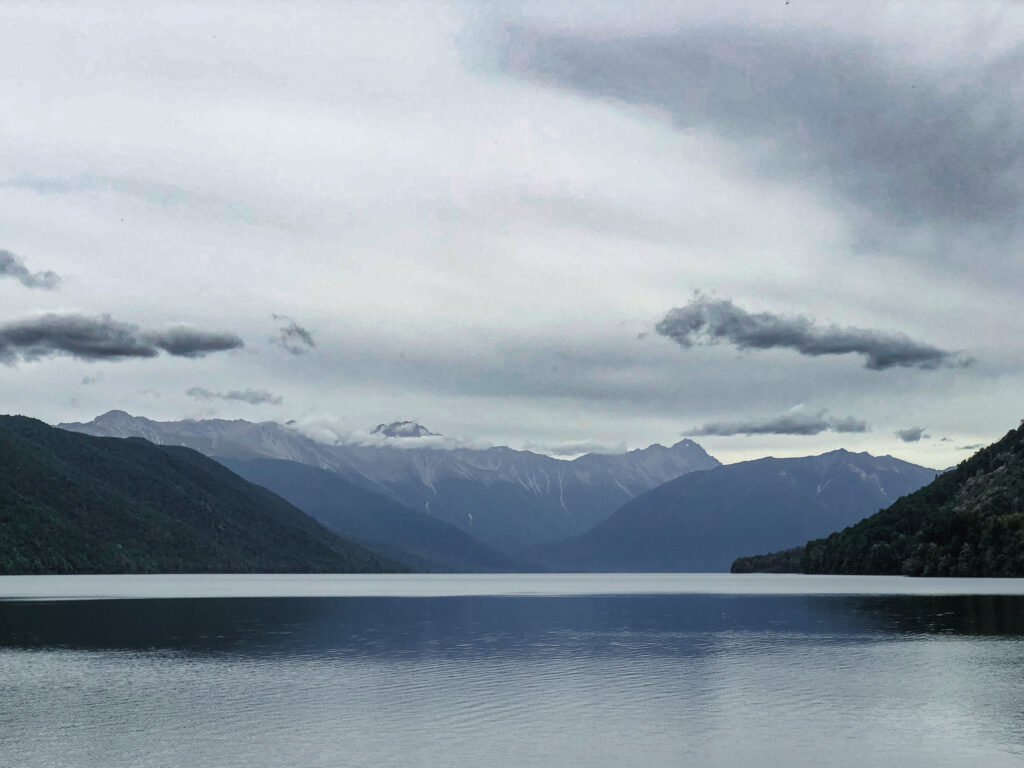 Ich habe auf jeden Fall das Gefühl, dass ich da angekommen bin, wo ich hingehöre. Die Sandfliegen und ich. Der Schwarm greift an, sobald ich mal länger als 3 Minuten an einem Ort verweile. Die Strecke von Blenheim Richtung Westport führt durch ein weites Tal, rechts und links Hügel. Schroffere Hügel, karger, fast schon Berge. Vielleicht sind es Berge. Und im Osten reihenweise Weinreben, kilometerlang.  Hier am Lake Rotora sind es definitiv nur noch Berge. Das Gras ist hier nicht mehr so grasgrün, eher strohgelb bis heugrün und die Wälder wie bei Sagaland. Akkorat gepflanzte Nadelbäume, aber auch „echter“ Wald, so wie hier direkt am See. Über meinem Kopf summt es, eine Wespenplage. Und in anderen Wäldern, Palmen und ein ohrenbetäubendes Grillengezirpe.