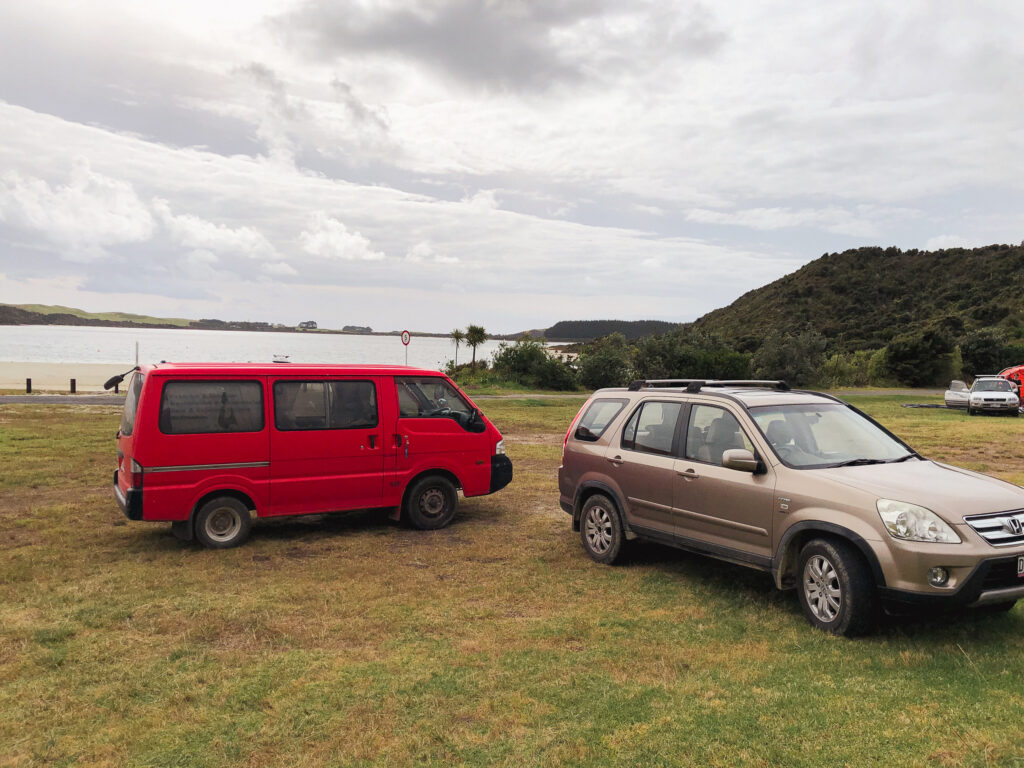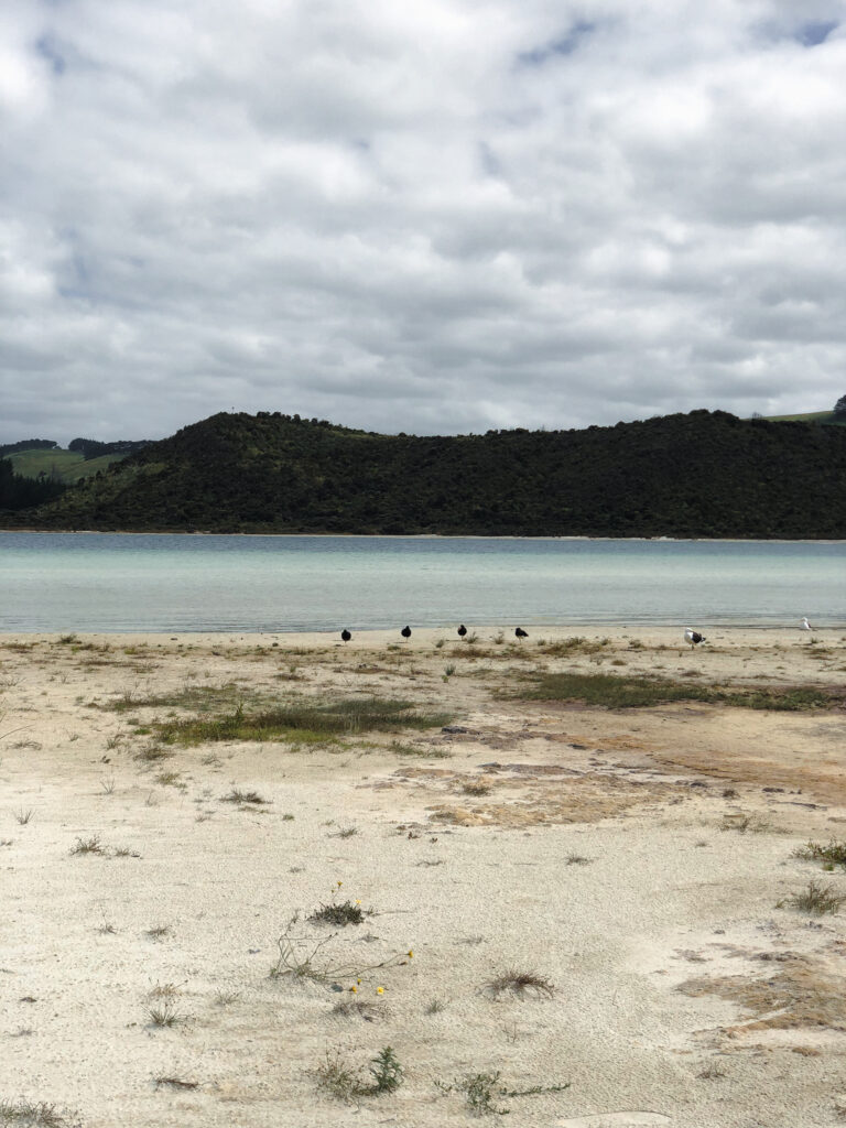 Der Weg von Maungaturoto (Robyn+Ben’s Zuhause) hier her war grün. Wie wenn Frankreich nicht wär’, in 300 Metern vom Schwarzwald dann direkt am Meer. Blau und grün. Wenn grün beruhigend wirkt, dann bin ich jetzt die Innere Ruhe in Person. Aufgewühlt nur noch von den schlaglöchrigen Schotterpisten. Ein „Achtung Uneben“ wäre bei uns wo möglich eine Vollsperrung. Aber so bleibe ich wach und der Sekundenschlaf kriegt mich nicht. Mit dem roten Mazda Bongo fühlt sich 60 wie 120 an. Wir passen gut zusammen, der Mazda und ich. Bei mir fühlt sich 30 auch wie 80 an. Meine Hüfte schmerzt und es macht mich wütend. Die erste Nacht haben wir am Sandstrand des Süßwassersees (!!!) Lake Taharoa verbracht, direkt hinter den Dünen, ganz nahe am Meer. Fast ohne Wind, so still, wie Urlaub. Am Ballermann. Mit einem Platz voll krasser SUVs und von allen Seiten unterschiedliche Musik. Wir haben trotzdem genossen, Pasta Tonno bei Sonnenuntergang. An Tag 2 haben wir vor dem Frühstück den See sogar umrundet. Nach zwei Stunden Spaziergang muss ich aufgeben. Die Hüfte. Ich frage mich was mir das Leben da sagen will. Weniger Gänge hab ich nicht.
