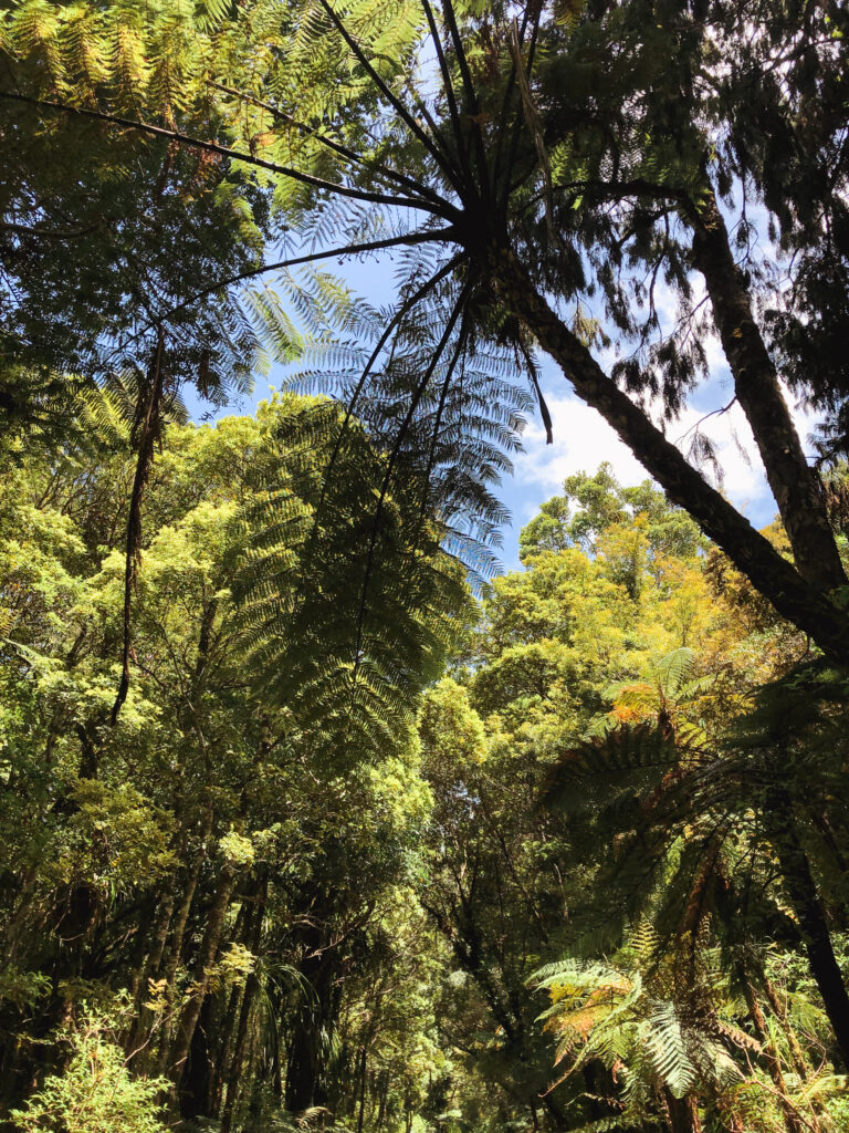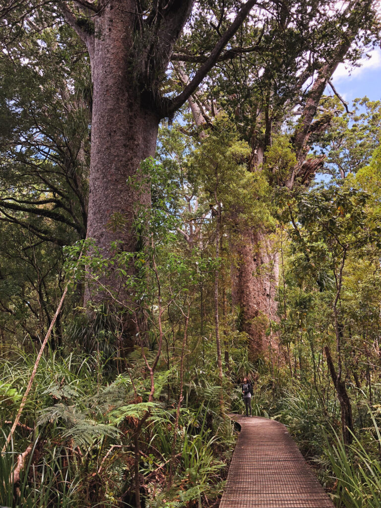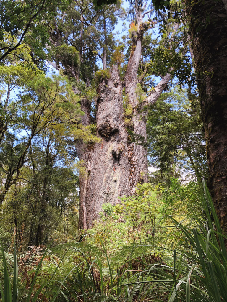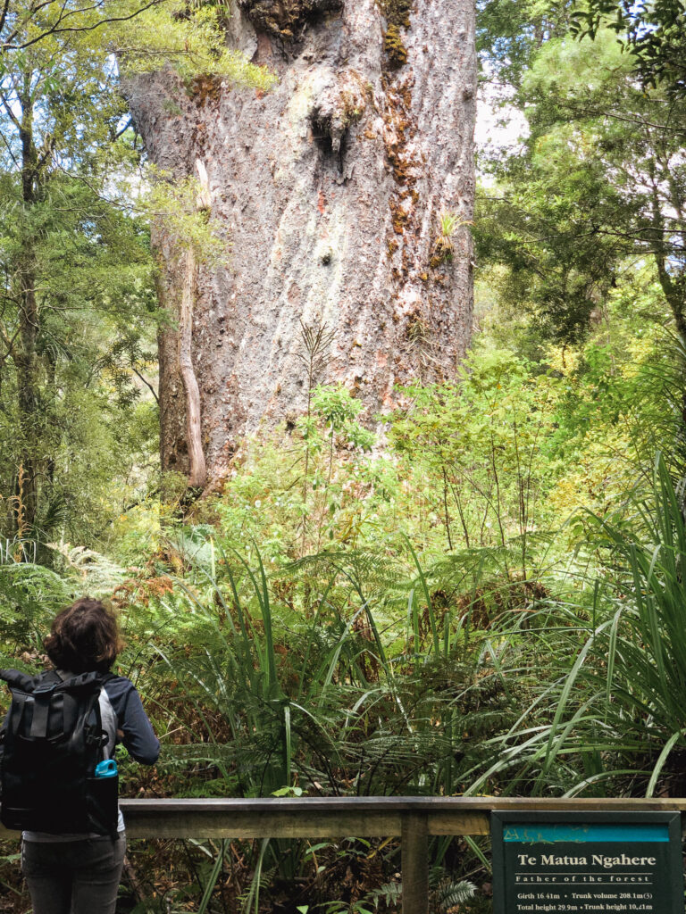 Zum Glück gab es in den Kauriwäldern (Waipoua Forest) altergerechte 15 minütige Spaziergänge zu den Hauptattraktionen, den größten Kauri-Bäumen (Tane Mahuta), die es in Neuseeland gibt. Alte große Riesen und ziemlich schön und beeindruckend. Auch die Fahrt durch den Wald, alles grün und wie Schwarzwald, wenn dann nicht die Farnpalmen wären (wunderschön!) und um die nächste Kurve, raus aus dem Wald, ab ins Allgäu. Aber Achtung Kiwi!