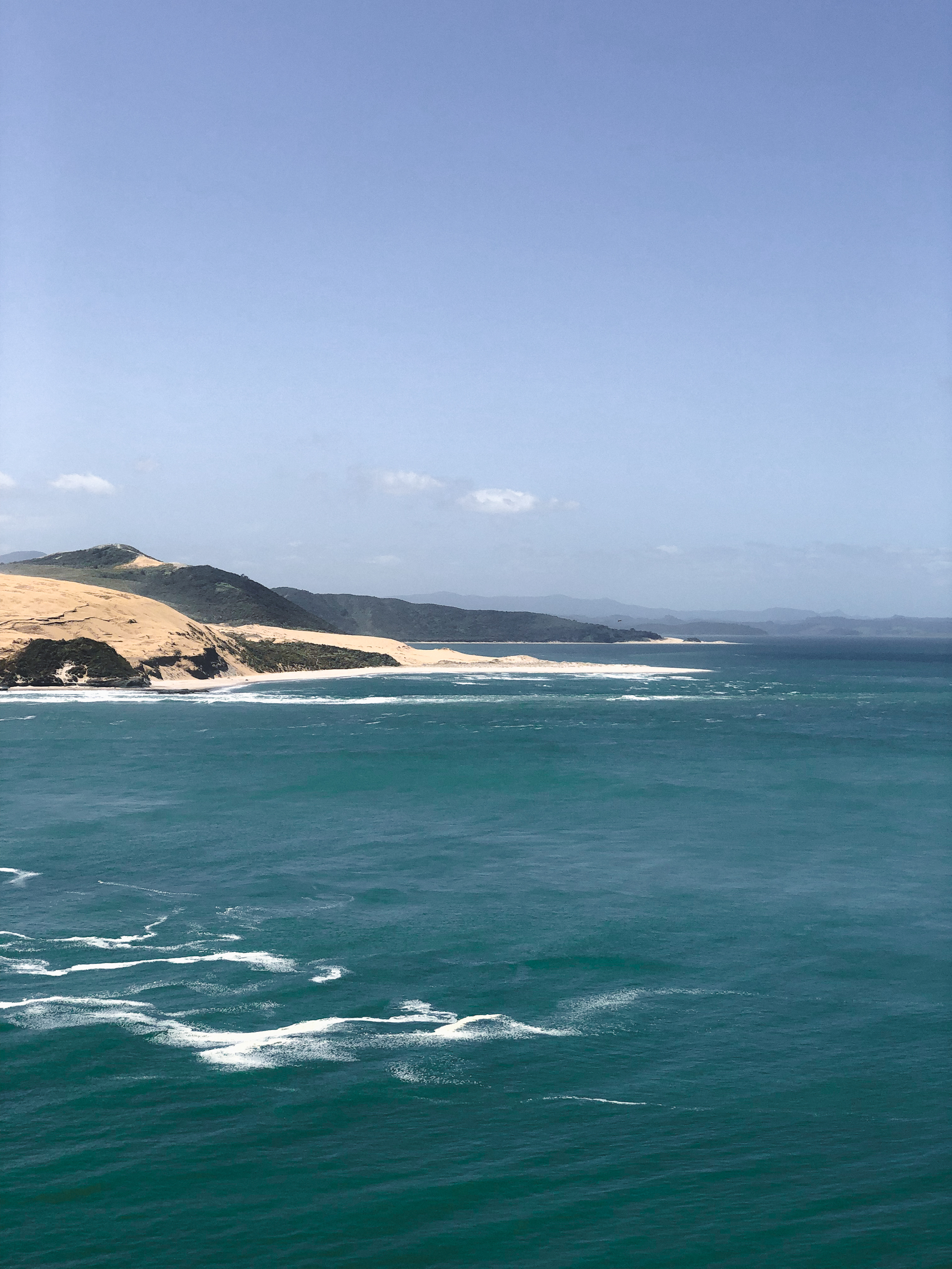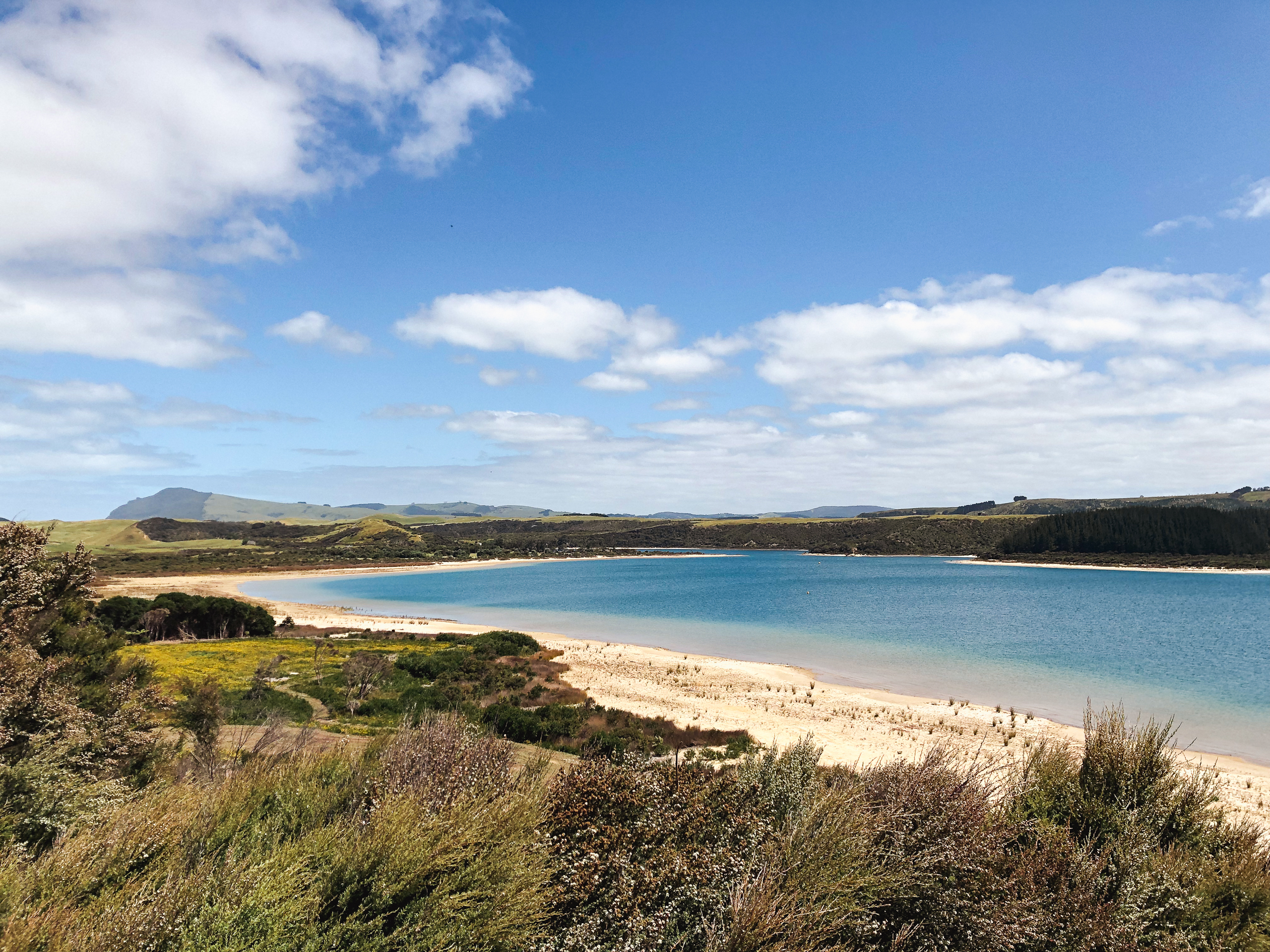 Der Weg von Maungaturoto (Robyn+Ben’s Zuhause) hier her war grün. Wie wenn Frankreich nicht wär’, in 300 Metern vom Schwarzwald dann direkt am Meer. Blau und grün. Wenn grün beruhigend wirkt, dann bin ich jetzt die Innere Ruhe in Person. Aufgewühlt nur noch von den schlaglöchrigen Schotterpisten. Ein „Achtung Uneben“ wäre bei uns wo möglich eine Vollsperrung. Aber so bleibe ich wach und der Sekundenschlaf kriegt mich nicht. Mit dem roten Mazda Bongo fühlt sich 60 wie 120 an. Wir passen gut zusammen, der Mazda und ich. Bei mir fühlt sich 30 auch wie 80 an. Meine Hüfte schmerzt und es macht mich wütend. Die erste Nacht haben wir am Sandstrand des Süßwassersees (!!!) Lake Taharoa verbracht, direkt hinter den Dünen, ganz nahe am Meer. Fast ohne Wind, so still, wie Urlaub. Am Ballermann. Mit einem Platz voll krasser SUVs und von allen Seiten unterschiedliche Musik. Wir haben trotzdem genossen, Pasta Tonno bei Sonnenuntergang. An Tag 2 haben wir vor dem Frühstück den See sogar umrundet. Nach zwei Stunden Spaziergang muss ich aufgeben. Die Hüfte. Ich frage mich was mir das Leben da sagen will. Weniger Gänge hab ich nicht.