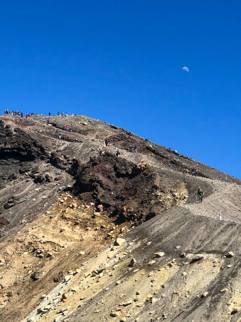 In einer gänsemärschigen Karawane und nur mit dem Busshuttle gehts zum 19 Kilometer langen Weg, der durch eine farbenfrohe Vulkanlandschaft führt.