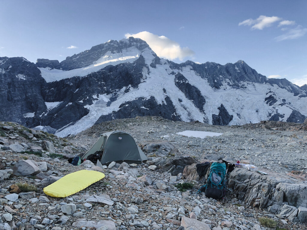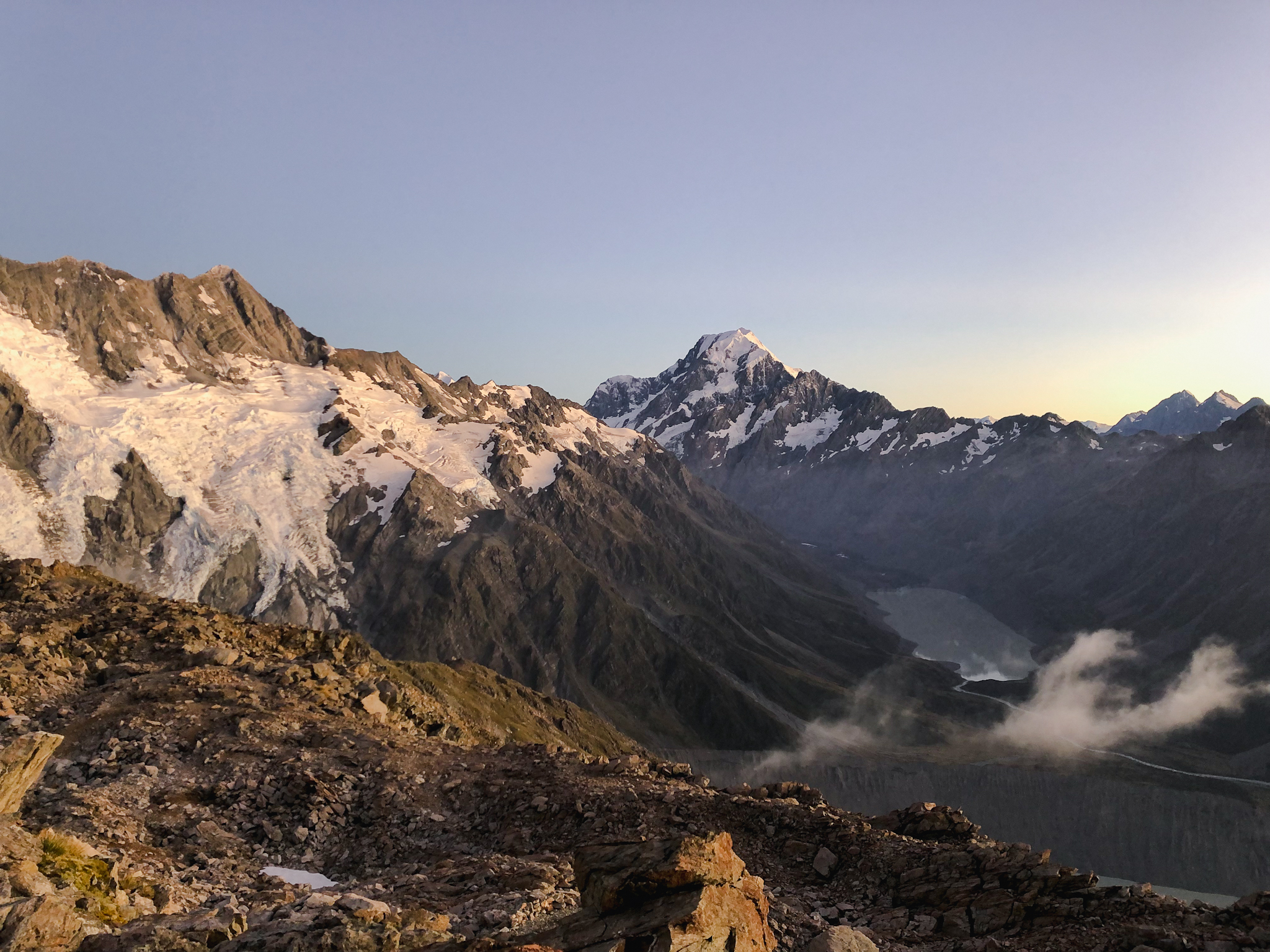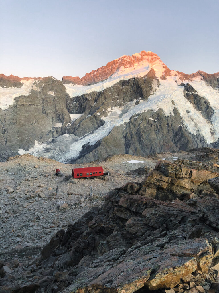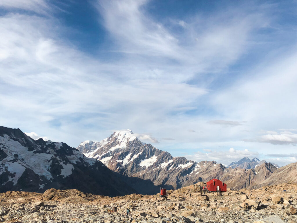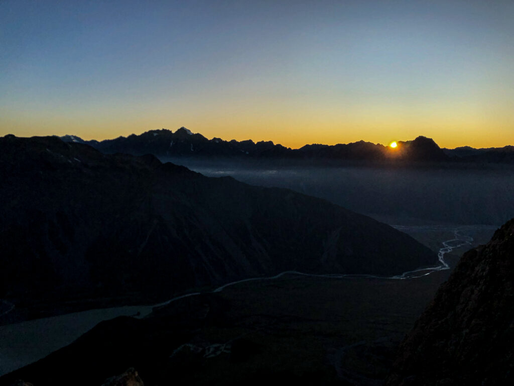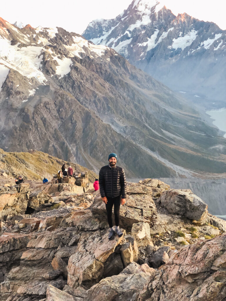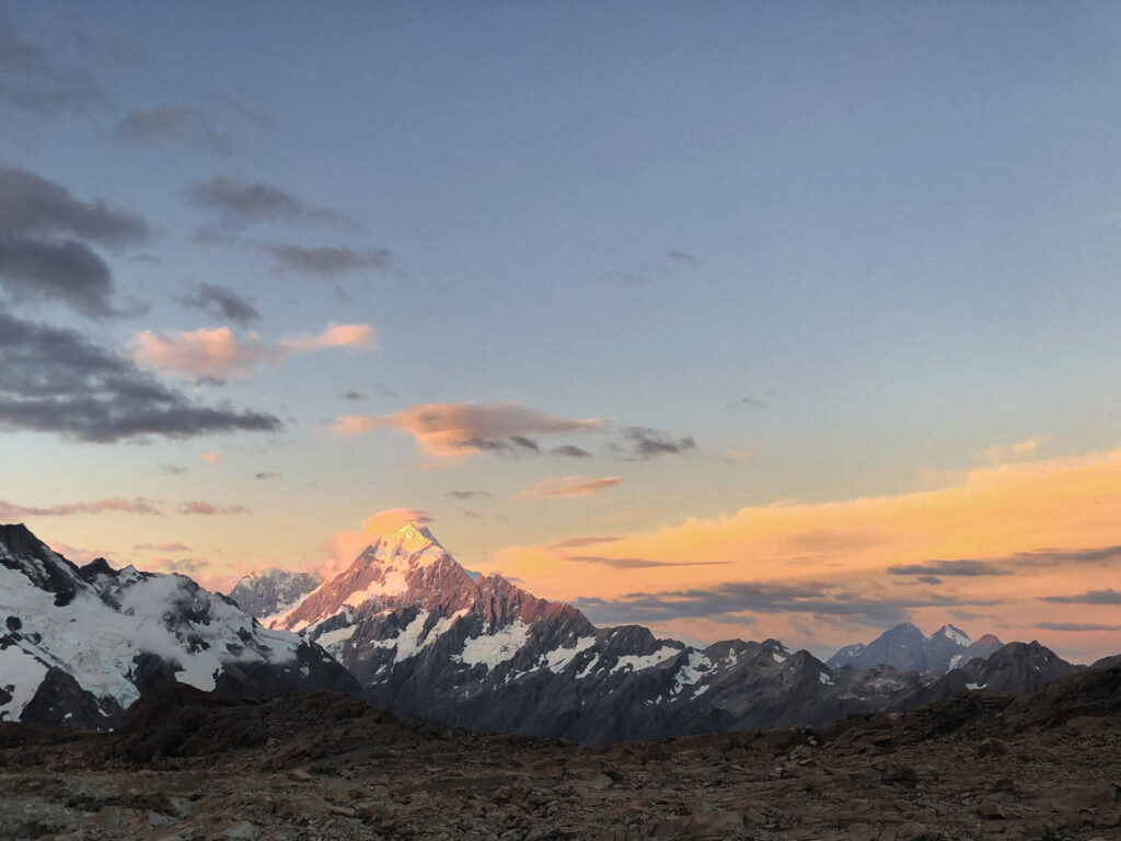 Er stand am Straßanrand und wollte zum Mount Cook. Ich auch. Und so hat es sich ergeben, dass ich doch keinen Tag Pause gemacht habe, sondern mit doppelter Kleidungsschicht (weil hält besser warm und bietet mehr Sicherheit gegen Übergriffigkeiten, was sich im Nachhinein als kluger Schachzug herausstellt) und einem zyprischen Sherpa den Weg zur Mueller Hut gegangen bin. Er bot mir Platz in seinem Zelt und nach etliche Stufen und Geröllfeld kam ich erneut in den „Genuss“ die Nacht auf dem Berg zu verbringen.