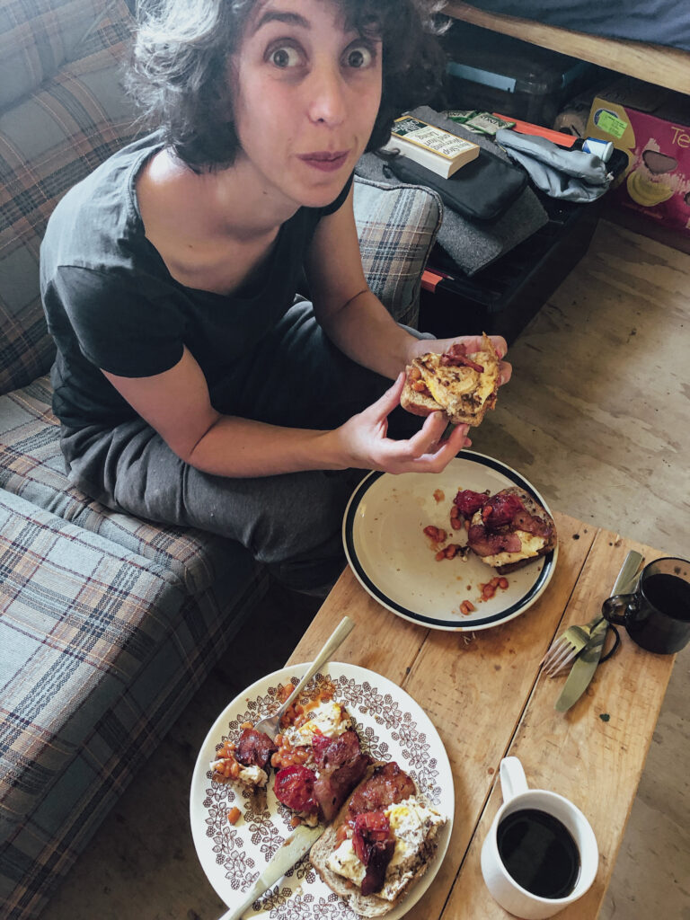 Hier werde ich die letzten Tage jeden Morgen von der Morgensonne geweckt, Robyn kommt über den Hügel zum Yoga, wir trinken Kaffee ohne Milch, statt Cappuccino, Regenwasser statt Mineralwasser, es gibt keine Schokolade (okay, dafür Salted Caramel Eis) und trotzdem fehlt es mir an nichts. Wenn niemand schaut tanze ich in der Sonne auf der Terrasse mit Blick auf grüne Hügel und das Meer. Sockendisko Deluxe.