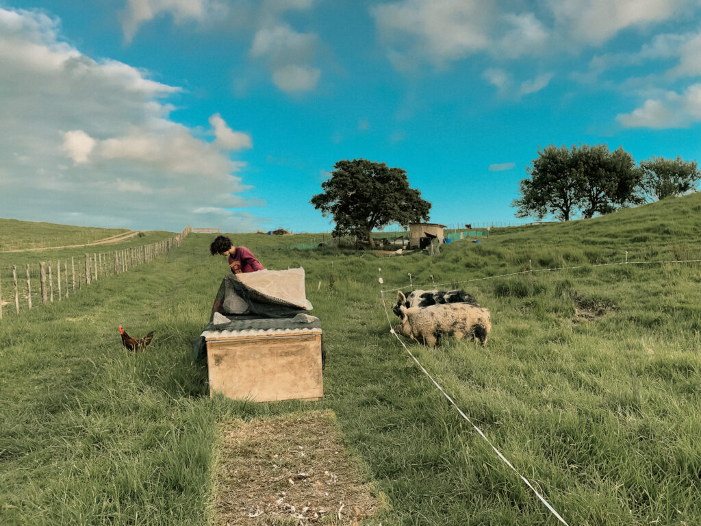 Die ersten Tage waren Ben und ich sehr damit beschäftigt Zaundraht zu entwirren und flüchtende Tiere einzufangen. Sobald die Schafe eine Fluchtmöglichkeit sehen, um das grünere Gras auf der anderen Seite des Zauns zu erreichen marschieren sie los. Genau wie die Schweine, die gelangweilt von ihren begrenzten Möglichkeiten, dann den Hühnern einen Besuch abstatten oder die Kälber aufmischen.
