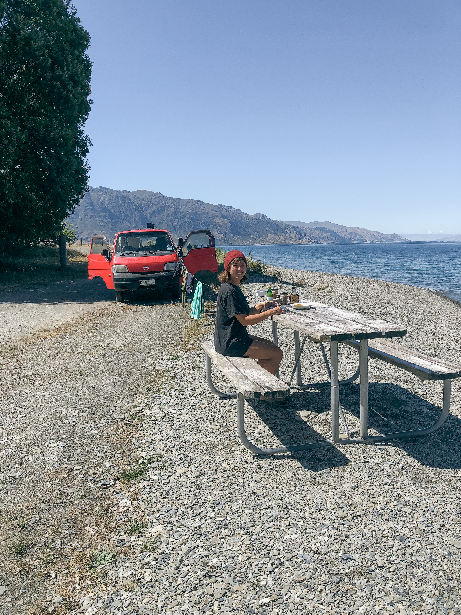 Also nun werde ich mich bei der nächsten Wanderung wohl besser über die Chancen auf Bergsicht informieren. Gut war es trotzdem, einfach weil ich es geschafft habe und meine Hüfte mitlief wie frisch geschmiert. Dennoch mach ich heute, am Tag danach lieber eine Pause, auch wenn es mir schwer fällt, hier am Lake Hawea zu sitzen und all die wunderschönen Berge um mich zu sehen und nicht zu wissen wie das alles hier nun von oben aussieht. Und noch dazu ist das Wetter wundervoll. Aber ich begnüge mich heute mit einem Bad im See und fülle meine Campingdusche mal wieder um mich ein bisschen frisch zu machen, bevor ich in die Stadt gehe.